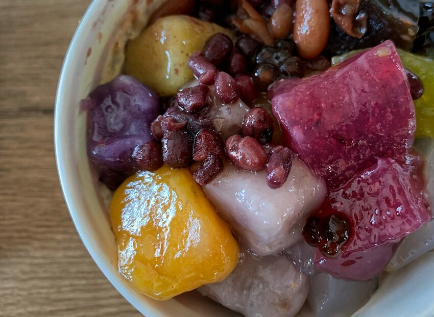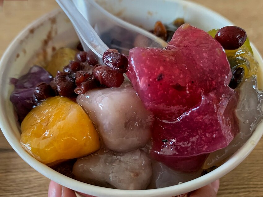 田媽媽豆花位在洗衫坑旁的樓梯往上走就可到,但我們是順著桂花朵朵旁的路一直走也可以走到,綜合豆花一碗40元,其餘單一配料的豆花皆為35元,另有冰熱可以選擇。這天我們點了一碗冰的綜合豆花來吃,坐上他們設計的戶外用餐區用餐,還真有讓人在鄉下吹著風吃著冰的愜意感。