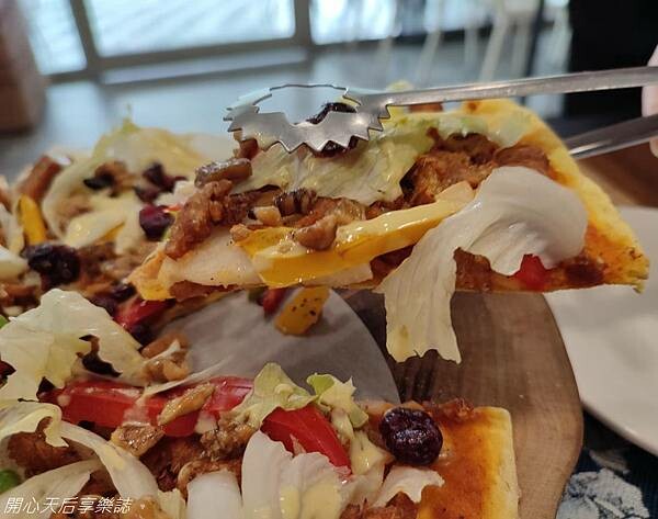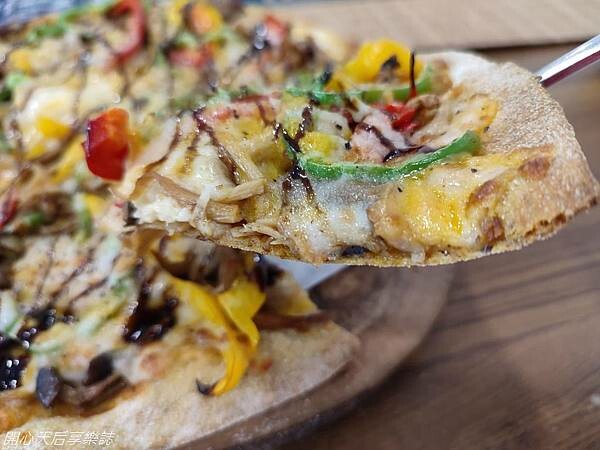 大口咀嚼,有著起司奶鹹味與鮮蔬、青椒、菇類的清甜味,讓我們一片接一片地往嘴裏送