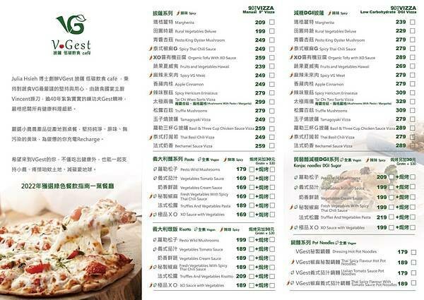 『V.Gest 披薩低碳飲食cafe』菜單,以蔬食漢堡、披薩、義大利麵、燉飯為主,也有優惠的加值組合餐系列