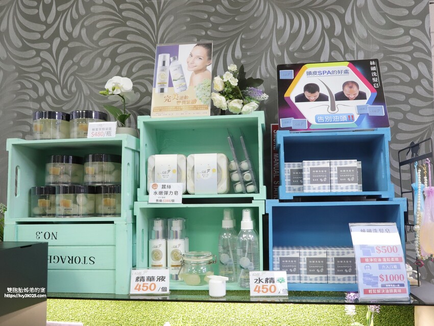 另有以蠶絲為主的女人身邊周圍的全身保養品展示櫃位,價格也比官網標示還要便宜許多,消費滿3000就可免運寄到家。
