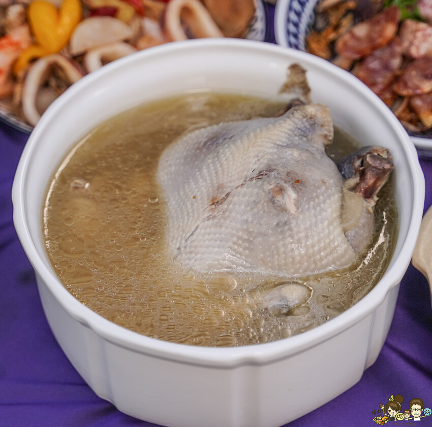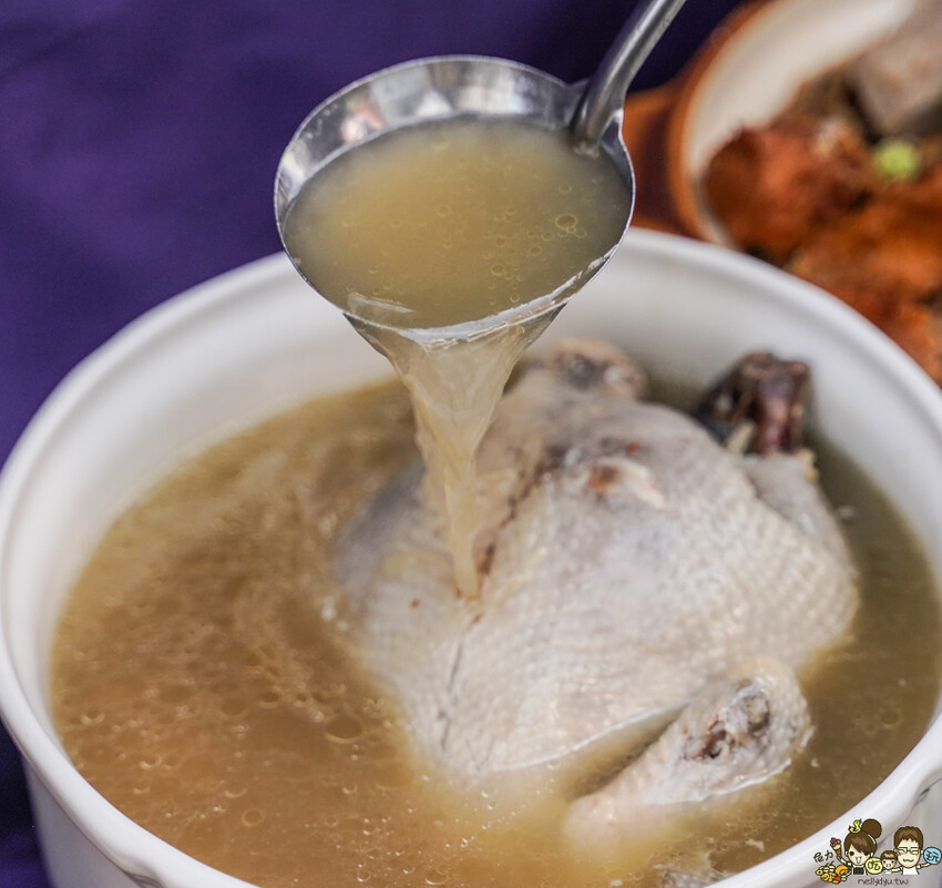湯內還添加了竹葉青料理酒下去燉煮,引出土雞肉本身的油脂滋潤湯頭
