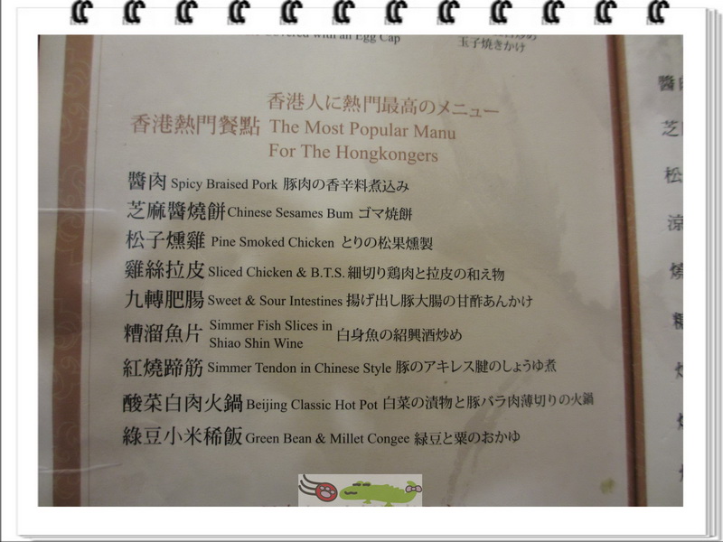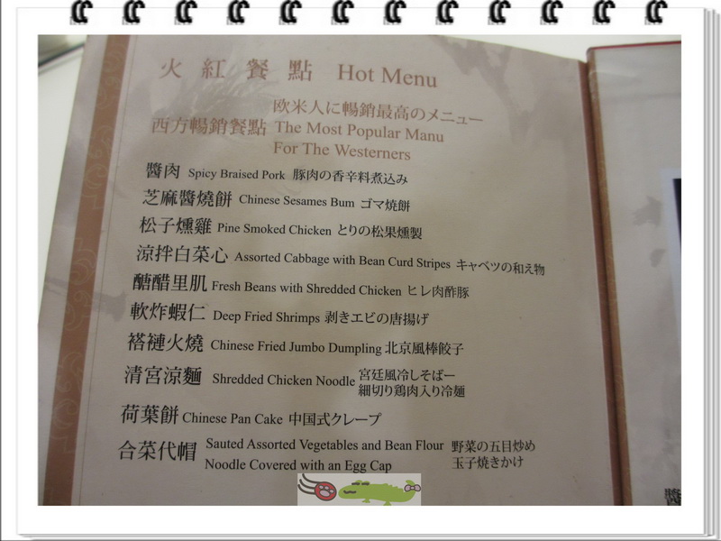 在等的時候先照了一下菜單,發覺這邊還有特別為日本人、歐美人和香港人常點的菜列出一張推薦表格。研究了一下發現,其實三個地區的人點菜差異並不大(是說,店裡也就是賣這些東西,要差異很大也有點困難吧~XD),不過日本人比較不會點「醬肉」和「芝麻醬燒餅」這兩道,而歐美和香港的口味差異不大,但是歐美不點「酸菜白肉鍋」這一道,是酸味無法適應嗎?XD