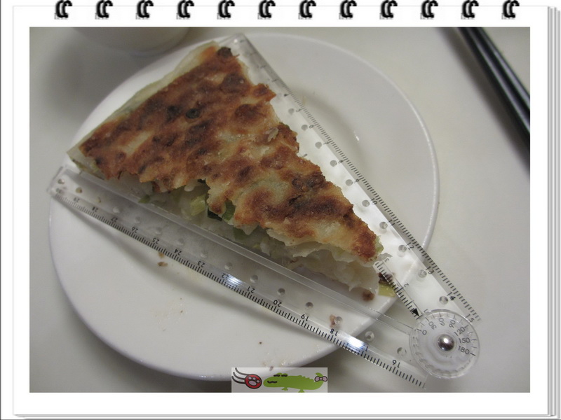 ㄎㄎ,重點是,這樣一大片除了厚以外,吃起來還蠻好吃的耶,不是中看不中吃的蔥油餅喔!麵皮的味道很香,可以吃得到麵皮的香Q,本身已經有調味了,所以還蠻有味道的(可是我一吃這種蔥油餅就不自覺的想加上台中名產的東泉辣椒醬呀!XD),不過一整片吃下來份量還蠻足的!所以我打包了另一片帶回家第二天可以加熱享用啦~XD