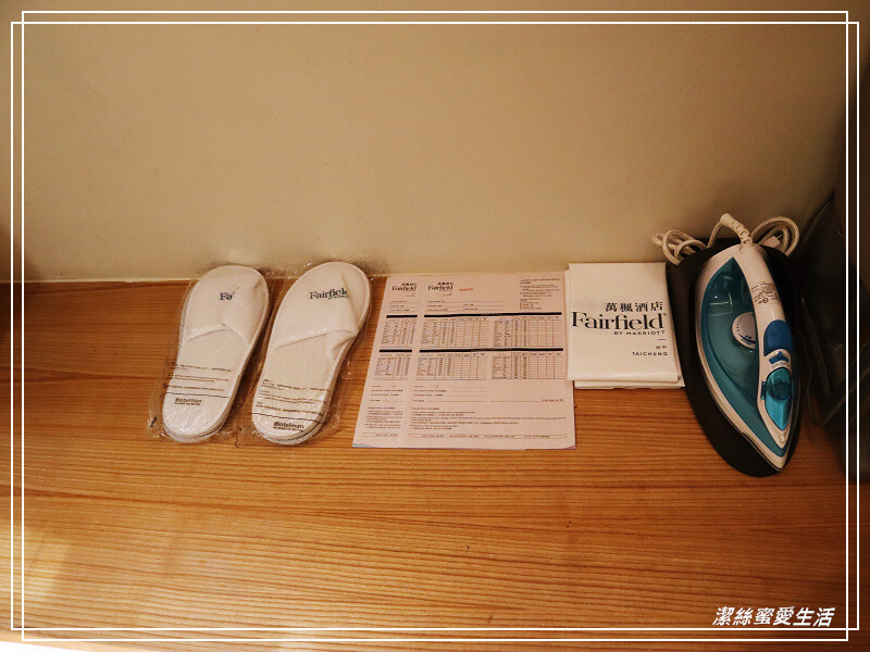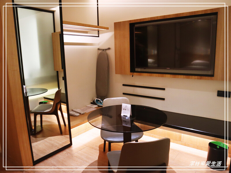 中間有張小圓桌,電視下方的行李台還蠻寬敞的,左邊是衣櫃,放置了室內拖鞋等用品,而且還提供了熨斗及燙衣板,是為了商務客可以在見客戶前把弄皺的衣服自行熨燙,還蠻貼心的。