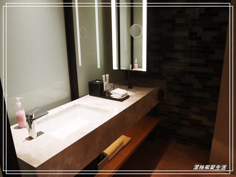 這裡水龍頭在左邊而不是中間覺得比較特別,下方平台則是浴巾及吹風機。
