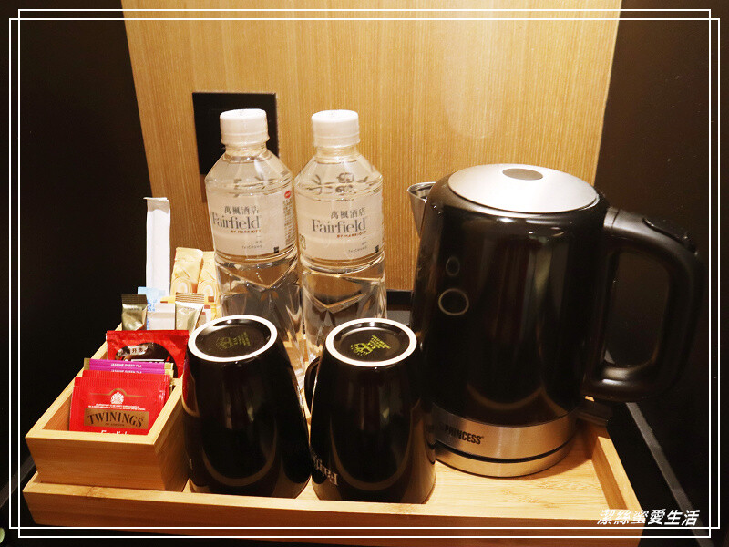 把衣櫃旁的穿衣鏡推開,是茶包及瓶裝水等備品,下層是保險箱,最底下則是小冰箱。