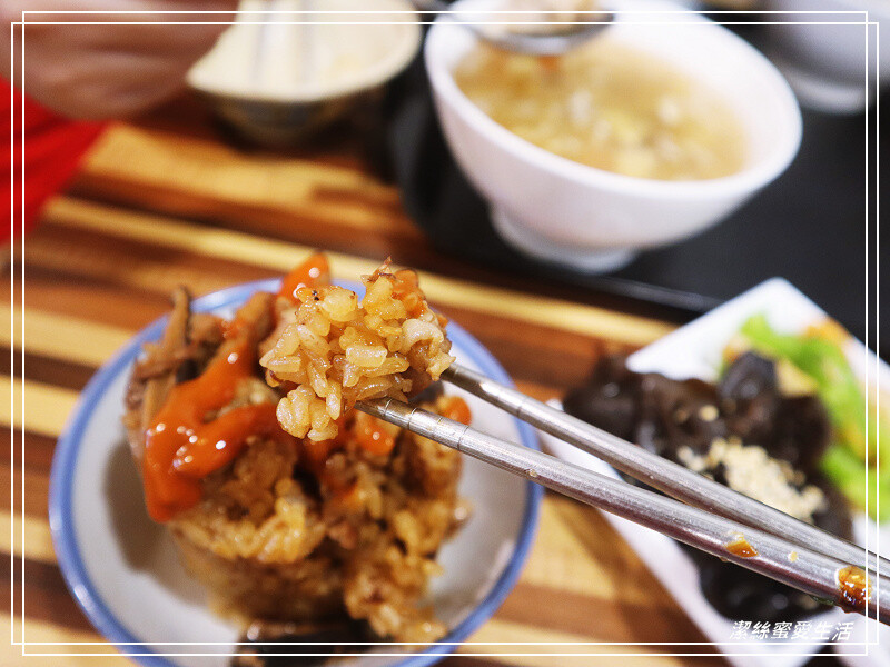 油飯是筒仔米糕的形狀,迷你可愛,份量也不多,可以看到頂部有不少的肉絲及香菇等配料。