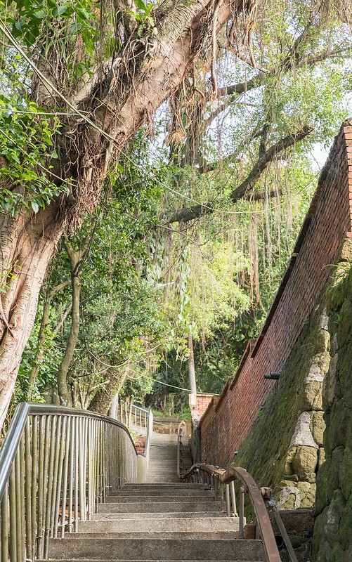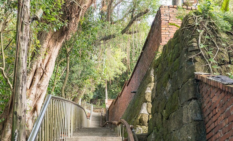 小段石梯後便是迷人的紅磚石牆,宛如日本戰國名城的石垣打込み接ぎ (植入工法),不管是底下的石垣還是上面的花雕紅磚都爬滿了綠苔,隱約可見的是背後的老街,和像是人去樓空的曾經豪宅,有一種莫名的滄涼和懷石幽靜。