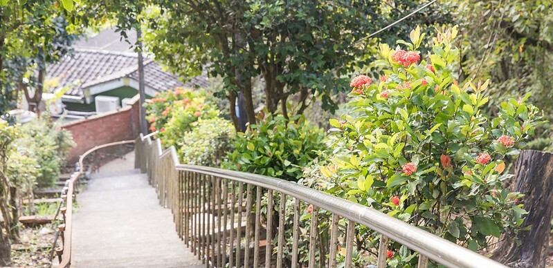 石梯兩側種滿杜鵑和山茶花,據說五六月的油桐花甚美,此時頻頻停下腳步,不在是為了回首紅磚屋,也不再是假裝拍照,只是一個勁的喘氣....。