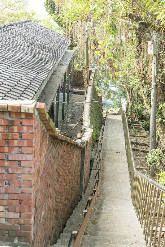 石梯的起點旁有一條彎沿的鐵軌,像是為了方便運送物資,這時我開始思索,猜想著到底這條石梯得有多長、多斜,才會讓人想建這條運輸鐵軌..不免有一點提前腳軟,想著要不要就此打倒回府..畢竟我從來不是個登山愛好者...。這時,一旁仍狂叫的小黑,好像看穿我心事的接著嘲笑,於是我只好硬著頭皮往上。這才一轉身、轉眼,我就忘了剛剛的疑慮。查了後才知,原來這條鐵軌早期是用來運送煤礦之用。