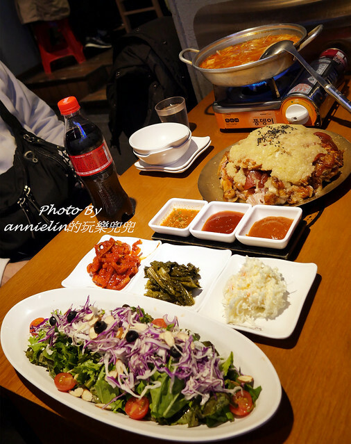 不只小菜,還有一鍋辣泡菜湯+一份刀削麵,和一大盤沙拉!
