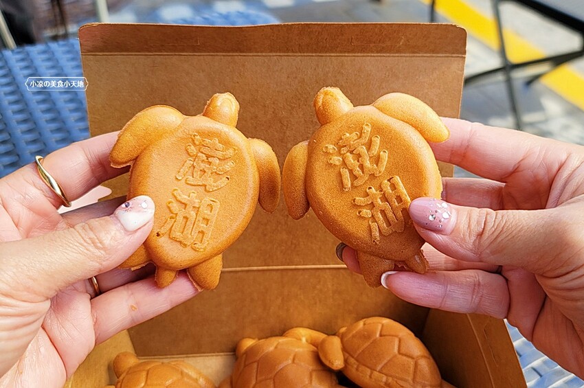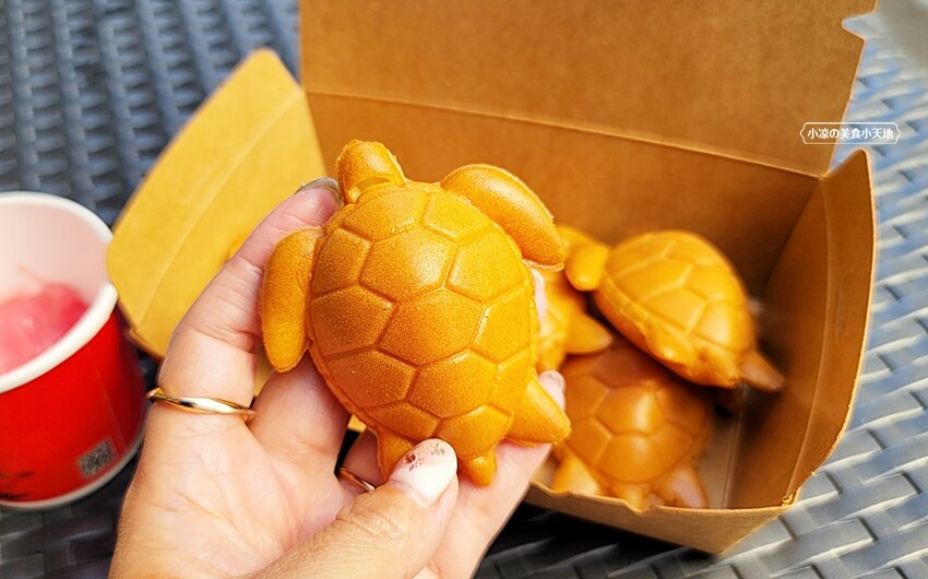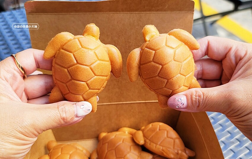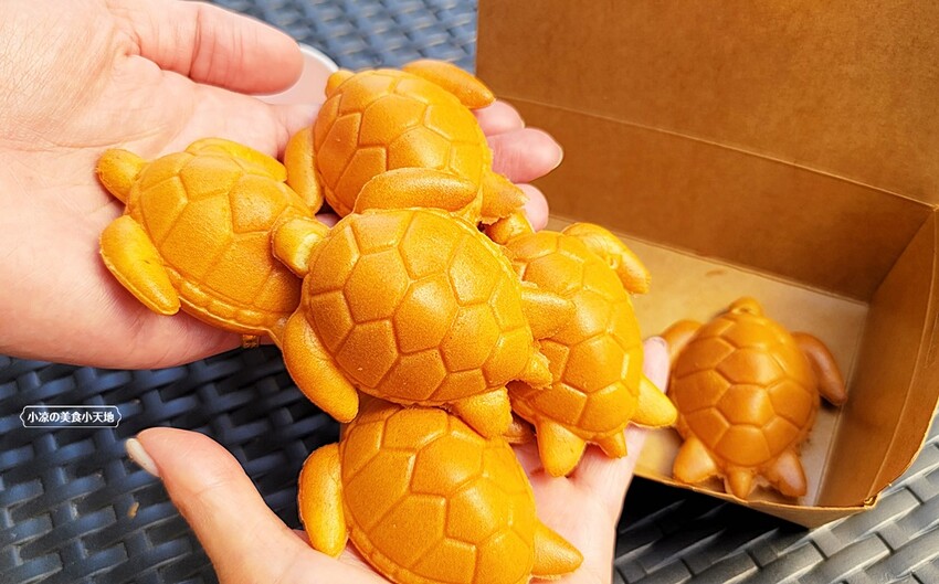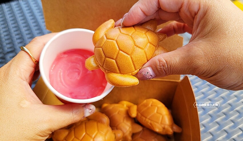 龜殼也明顯地烙印,未來不知道是否有人會將它加入天然色素,化身綠色的正港海龜呢XD 海龜雞蛋糕建議一拿到就先吃,才拿吃到雞蛋糕的外酥內綿密,但原味吃起來會比較偏乾一點點,小凉個人比較喜歡沾醬吃~~