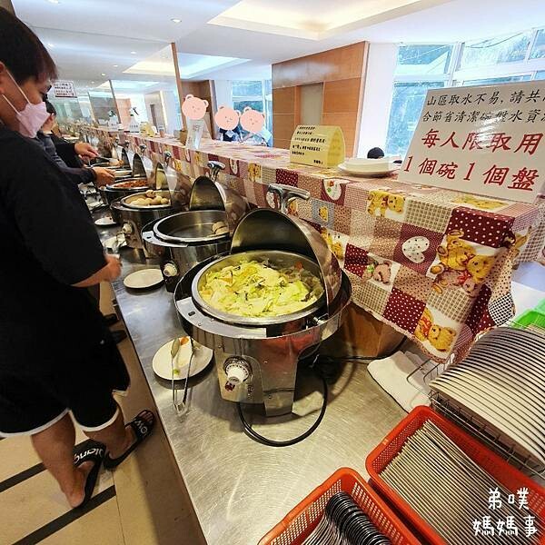 取餐又只有一個路線,等待許久。這裡的早餐很簡單,蛋一人一顆、盤子、碗一人一個