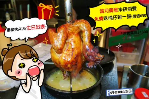 壽星消費滿1800元也送桶仔雞!低消不含酒水,都是簡單拍照打卡上傳FB與好評即可兌換!