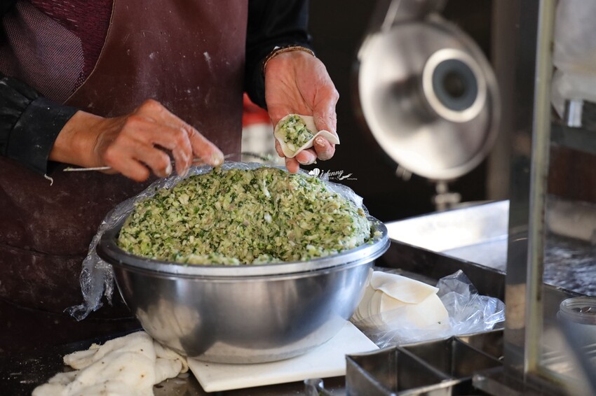 這天在現場只有三個人工作人員,老闆娘是主廚,負責煎台作業。但她也會利用空檔包鍋貼,大約一秒就可以包好一顆。