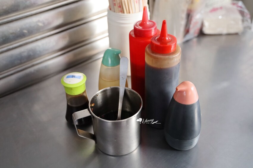 我們坐在騎樓上的鐵桌,桌子也有各式各樣的調味料,有白醋、烏醋、醬油、東泉辣椒及生辣椒醬油等。