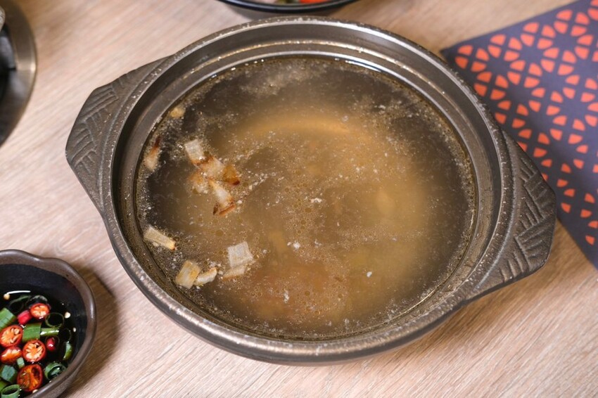 ▼【鼎宴精緻鍋物】湯頭共有10多款的品項,招牌日式石頭鍋以麻油為基底,放入乾魷魚和洋蔥拌炒熬煮,喝起來香甜順口不死鹹,帶有淡淡的迷人柴魚香氣~
