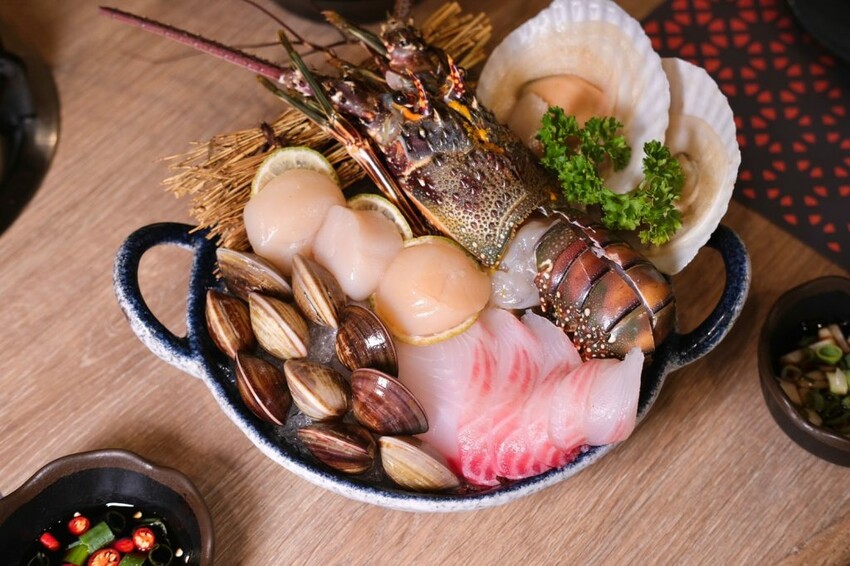 ▼澎派度十足的海鮮龍蝦套餐,包含龍蝦、北海道生食干貝、鯛魚片、大扇貝和蛤蠣,食材用料鮮度十足不手軟,龍蝦肉的口感紮實且彈牙,在嘴裡散發出鮮美的甜味,另外蛤蠣和干貝也都很大顆,放入湯頭熬煮喝起來更加清甜~