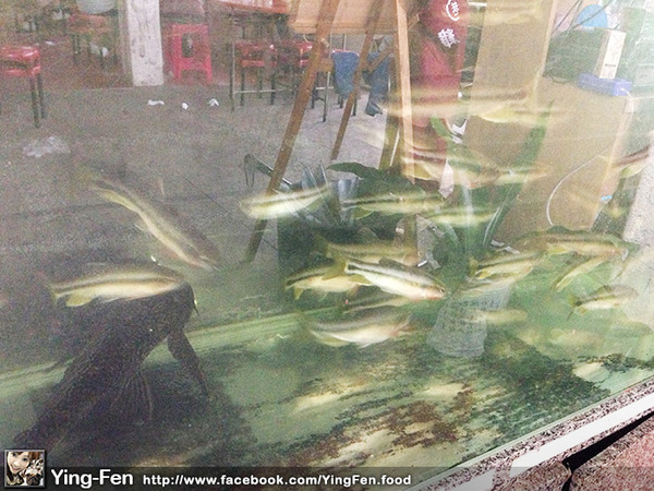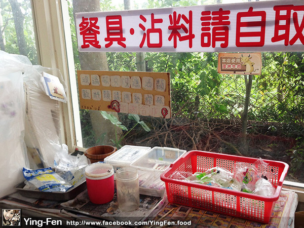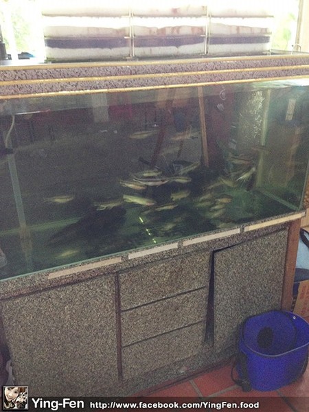 魚缸旁邊是給客人自取的餐具、醬料和塑膠手套。