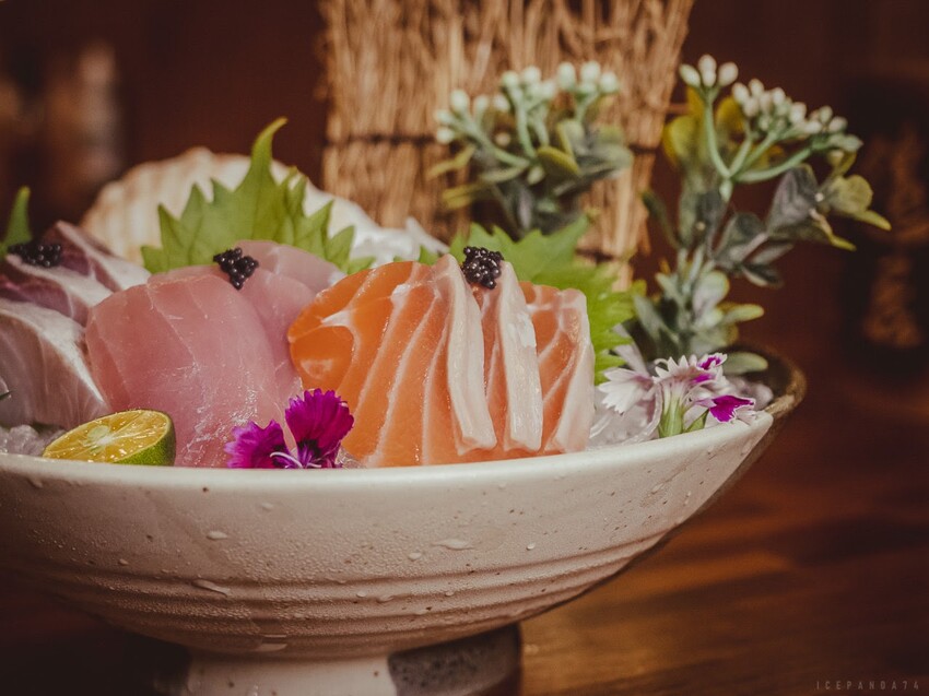 隱居海港刺身當日使用的魚類有:紅魽、旗魚及鮭魚,因應季節不同,端上桌的刺身魚種也會跟著變化,每一種種類的刺身都會再用魚子醬點綴,山葵放置在碗的邊緣,可以先沾醬油,再放上一些些山葵,一口吃下,會有滿滿的幸福感啊!