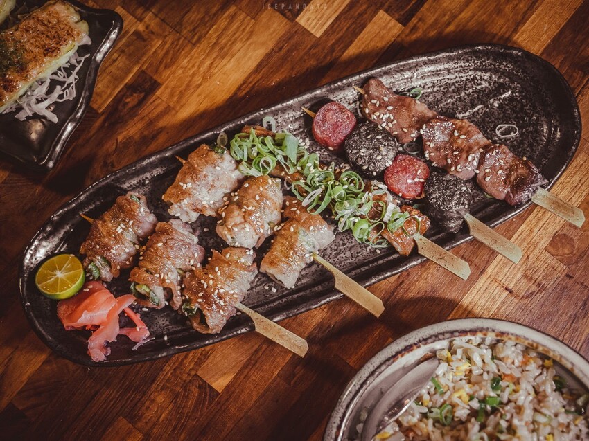 若覺得串燒不能滿足的愛嗜肉的朋友們,可以再另外點選烤肉的品項,每一項端上桌來就是滿滿的肉呀!像是伊比利豬肋條、胡麻伊比利豬、玫瑰鹽烤牛小排等,都是一些光聽名字就快攔不住口中的猛獸!烤得兩面金黃的伊比利豬,吃起來的口感讓人大愛,淡淡的胡麻香氣在嘴裡發散,帶有Q度的嚼勁肉質,會讓嗜肉者垂涎欲滴。