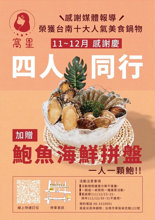 「窩星」早午餐/私藏鍋物,會不定時推出各種季節性活動來回饋喜愛他們的客人,11~12月(2022年)推出點鍋物四人同行,不用另外加購就送鮑魚海鮮拼盤啦;五/六/日限定每天十份,只要點日本和牛餐+99元就享活體爆卵紅蟳乙隻呢,誠意滿滿。