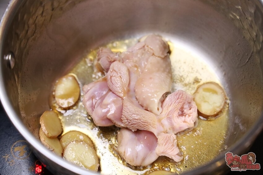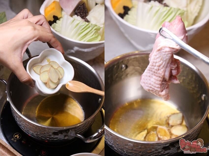 和過往許多鍋物店不同,直接幫你製作好出餐,來到窩星直接讓你看到真材實料,親手自己DIY加入麻油、蒜片以及帶皮土雞腿爆香,再加入高湯及特調的麻油雞中藥酒,那濃郁的麻油雞香氣飄出,邊拌炒還會邊忍不住吞口水呢XD