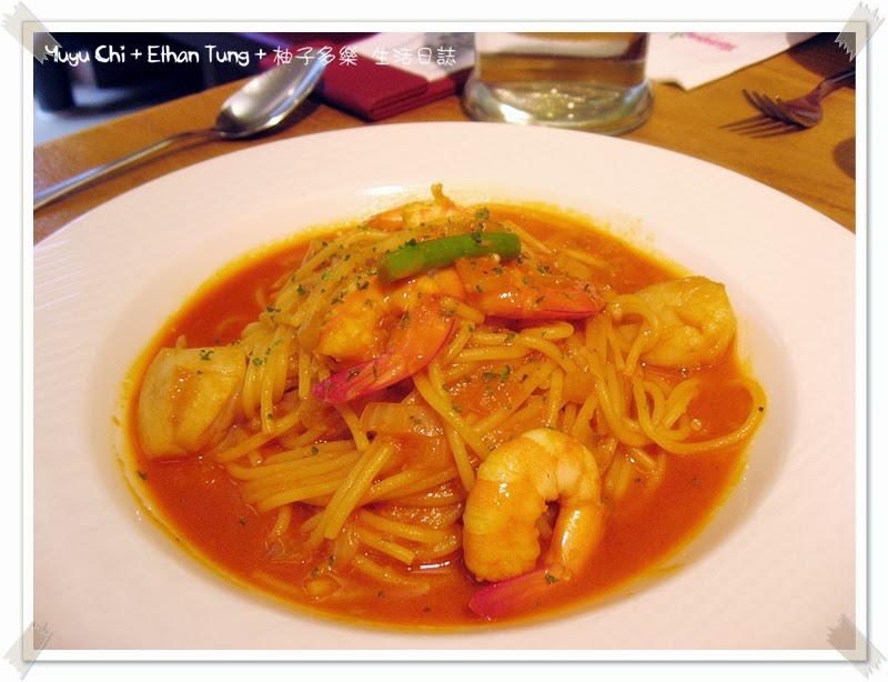 “粉紅醬鮮蝦雞肉義大利麵” 是招牌菜之一,蝦子新鮮度夠(至少這次吃我沒有起疹子),分量十足,我看上門的女孩子幾乎每桌都會點這一道,就跟甜點 “熔岩巧克力” 一樣。只可惜我們這桌三份巧克力的其中一份,上桌前就已經自爆了,所以樂趣就少了一份了...。