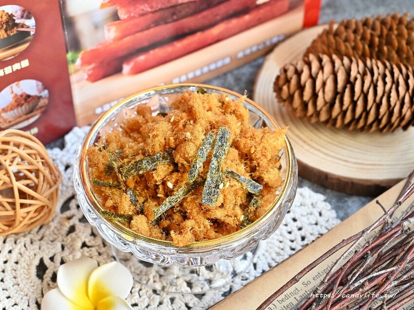 採用新鮮台灣豬肉,以手工不斷翻炒,再撒上白芝麻及海苔,口感蓬鬆,入口即化,單吃不鹹膩,吃得到豬肉的鮮甜及白芝麻的迷人香氣,配上稀飯可以來上好幾碗