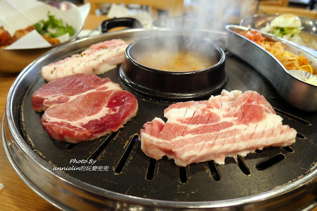 先上桌的烤盤上已經有豆芽、泡菜、蒜片等小菜和大醬湯,