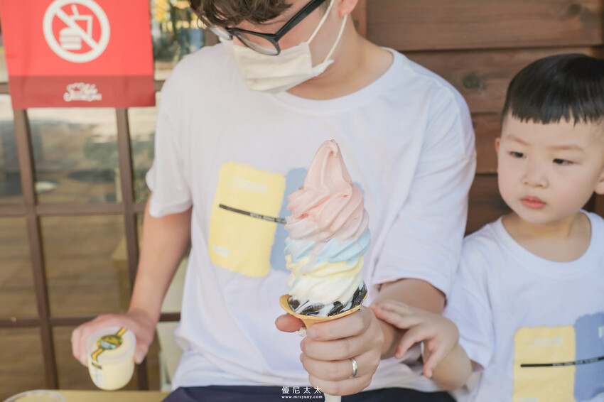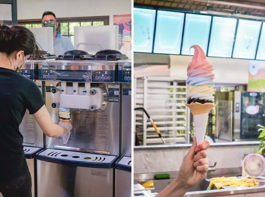 雖然這隻冰淇淋的價錢讓人驚訝,但是不誇張,現場真的是人手一支,畢竟誰能抵擋得了彩虹霜淇淋,搭配店家外面的巨無霸造景真的太可愛了!一支巨無霸冰淇淋可以吃到六種不同口味,由上而下分別是紅心芭樂、藍莓、海藻、奇異果、牛奶、金鑽竹炭香草,炎熱天氣之餘,來支濃郁的冰淇淋實在是太享受,不過這裡有個小叮嚀,這款冰淇淋融化的速度極快,拍照的速度要快一點喔(笑)