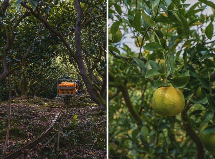 爬上坡到一半,突然聽到山頂上傳來轟隆隆的聲音,原來是『採果單軌車』正在出動,隨著柴油氣味的環繞,大家反而興奮的衝到單軌車旁邊觀看他的載貨,滿車黃澄澄的椪柑,正準備被送往工廠進行去塵及篩選。方才有提及,整個園區是位在山坡上,設置這個單軌車實在太方便了!不僅可以讓果農不用費力搬運,也讓園區更具特色。