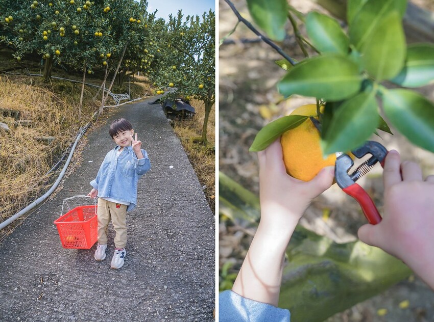 每組家庭,老闆會提供一給紅色籃子給你承裝,簡單說明一下如何採果後,發放椪柑專屬的彎曲剪刀,不僅鋒利,特殊的彎刀設計,讓旅人也可以完美的剪下椪柑,不過,彎刀真的很鋒利,家長們要特別留意不要讓孩子們把玩。