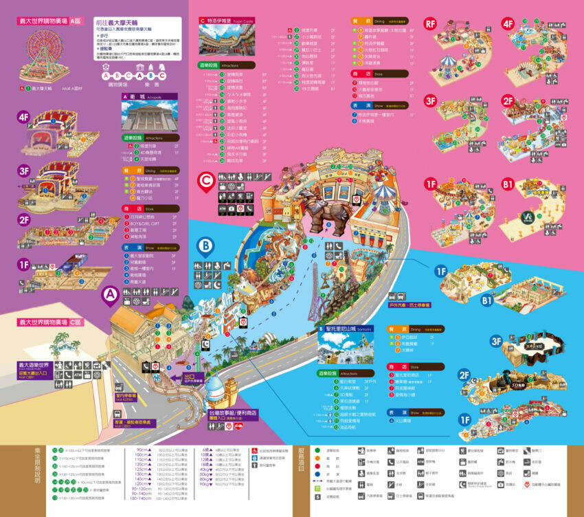 狹長型的園區可以分為「衛城(A區)」、「聖托里尼山城(B區)」、及「特洛伊城寶(C區)」三個區塊,來看看各有甚麼特色,而號稱全台遊樂園設施數量最多的義大遊樂世界,有哪些是你不能錯過的必玩設施呢?