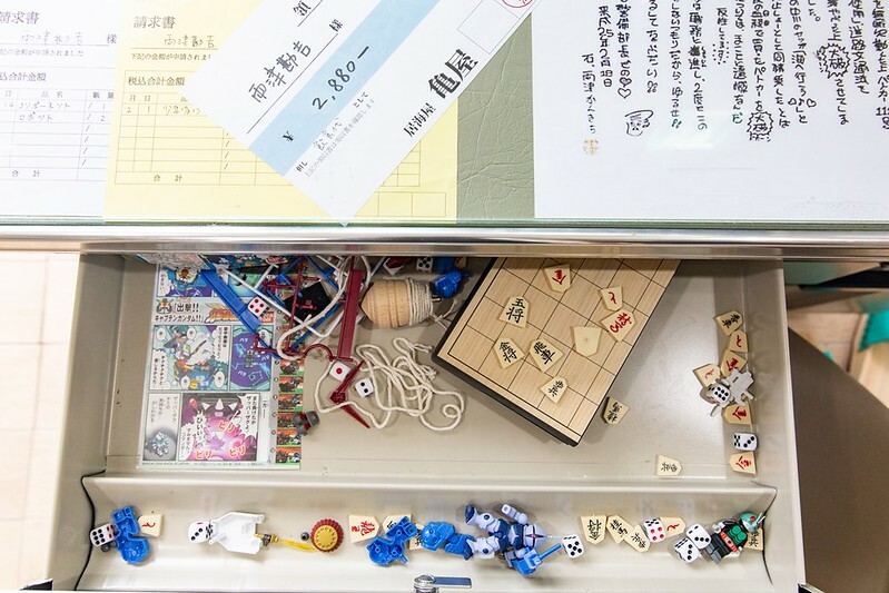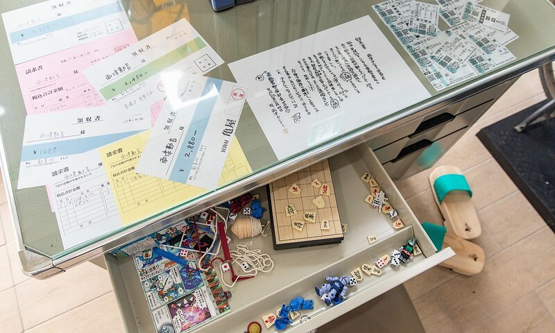 值得讚許的是這張桌子上,還放滿了漫畫中兩津桌上的雜物,就連將棋和他穿的木屜都有,還有好幾張勘吉簽收的請款收據,唯妙唯肖。