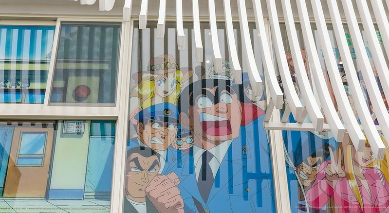 大樓兩面內外貼滿了「烏龍派出所」的大型海報,無論那個角度都可以看到兩津兩津勘吉和兩位俏麗警察的身影。