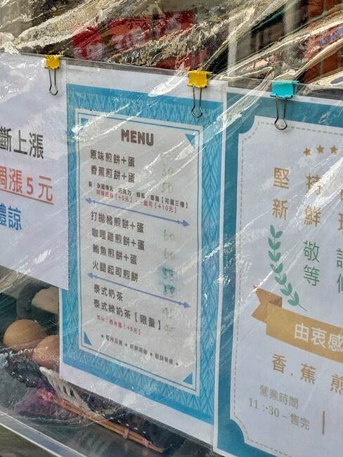 除了甜口的也有打拋豬、咖哩雞、鮪魚、火腿起司等鹹口味的,還有泰式奶茶喔。