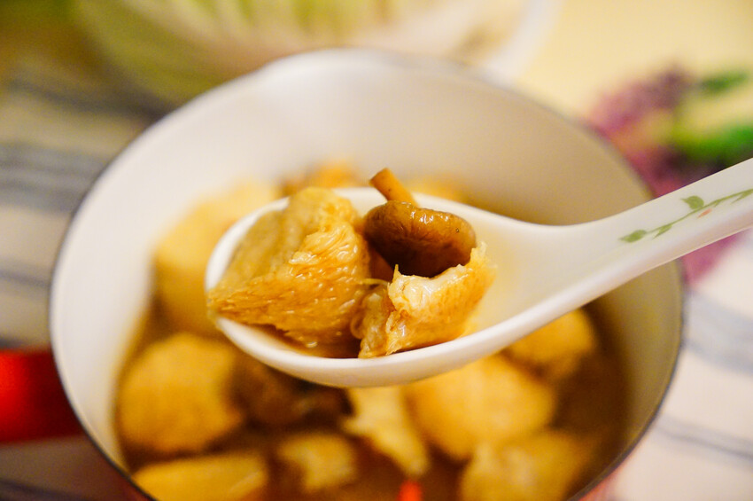 湯底以老薑、香菇、猴頭菇細火熬成,精華濃縮在湯頭,單喝鮮甜,再加上以正宗麻油乾煸後的老薑香氣,一口彈牙的猴頭菇、一口暖暖的湯,秋冬在家想來點溫暖的料理補一下身體也可以很方便!