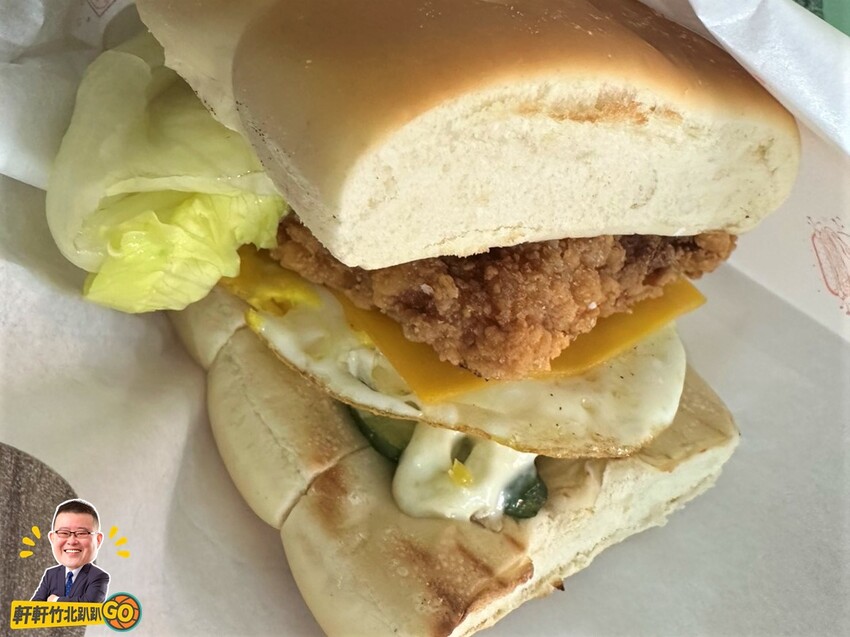 竟然是用蘋果麵包夾著卡啦雞、起司、荷包蛋、生菜等滿滿餡料耶,這應該是全台首創了吧!