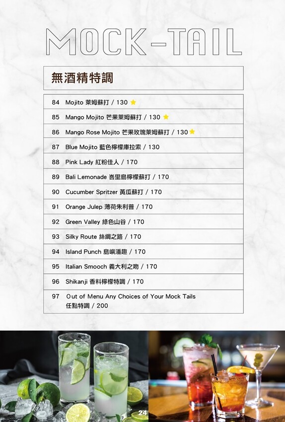 芒果萊姆蘇打 Mango Mojito(130元),屬於無酒精的特調飲料,有芒果甜香和蘇打的碳酸口感,不喝酒的朋友也可以有微醺享受喔。
