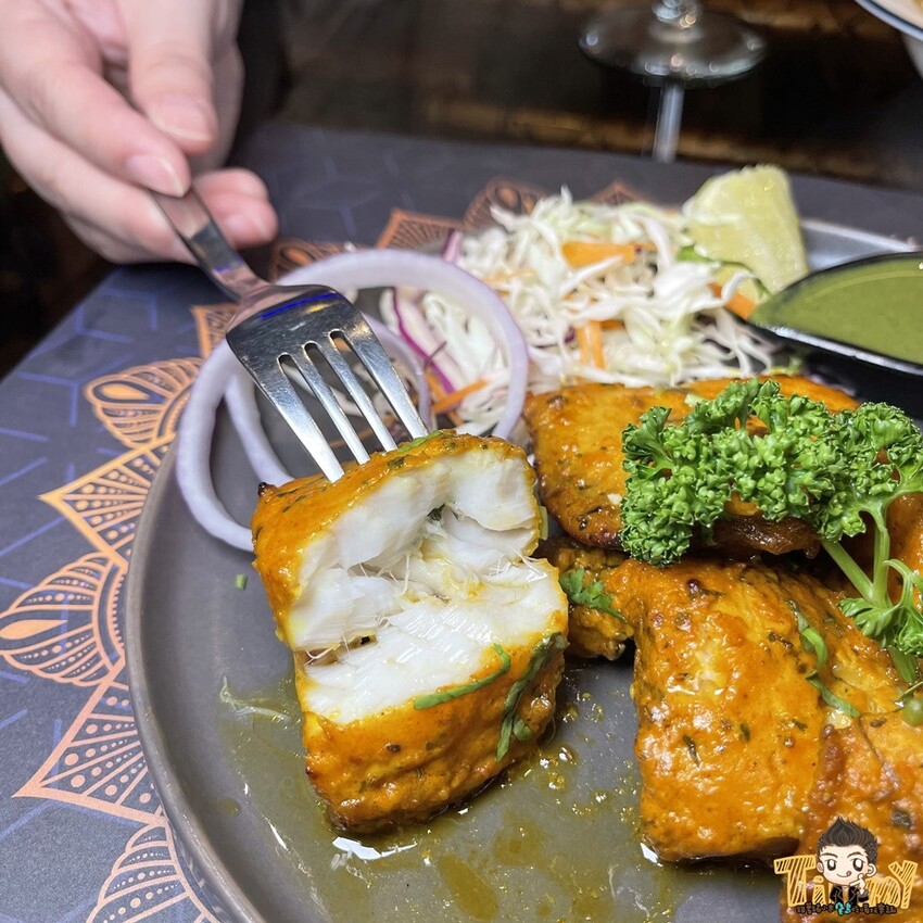 炭烤鮮魚(350元),台灣鯛魚去骨後切塊,以瑪沙拉醬汁與香料醃製,再放入塔都窯燒烤。