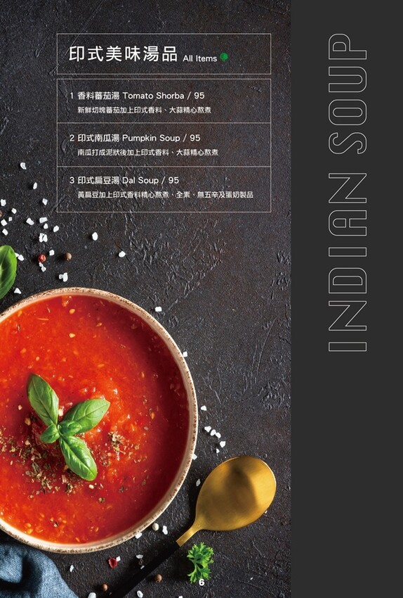 這次在朝富路上開設的分店,維持一貫印度宮廷風的裝潢設計,搭配各式前菜、烤爐料理、咖哩、甜點和特調飲品,完美呈現了印度料理的精髓。