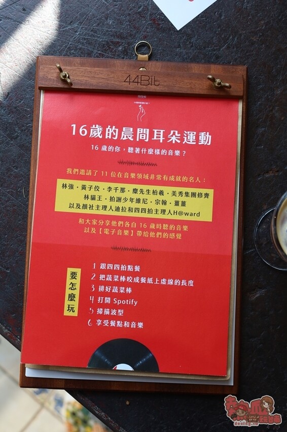 四四拍邀請了11位在音樂領域非常有成就的名人,和大家分享他們16歲時聽的音樂以及電子音樂所帶給他們的感覺,只要來店內用餐就可以一張歌單,只要把蔬菜棒咬成餐紙上虛線的長度就可以獲得啦~