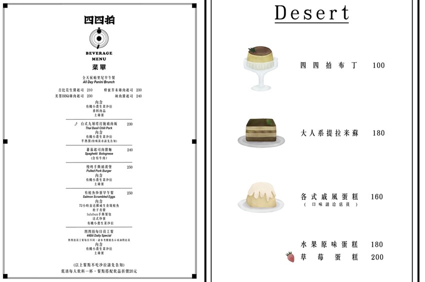 餐點選擇上有全天候的帕里尼,還有漢堡、肉醬麵和早午餐以及很特別的四四拍每日員工餐,低消每人飲料一杯,餐點搭配折價20元~另外還有甜點可以選擇,飲品部分有特調類的氣泡飲品也是高人氣~