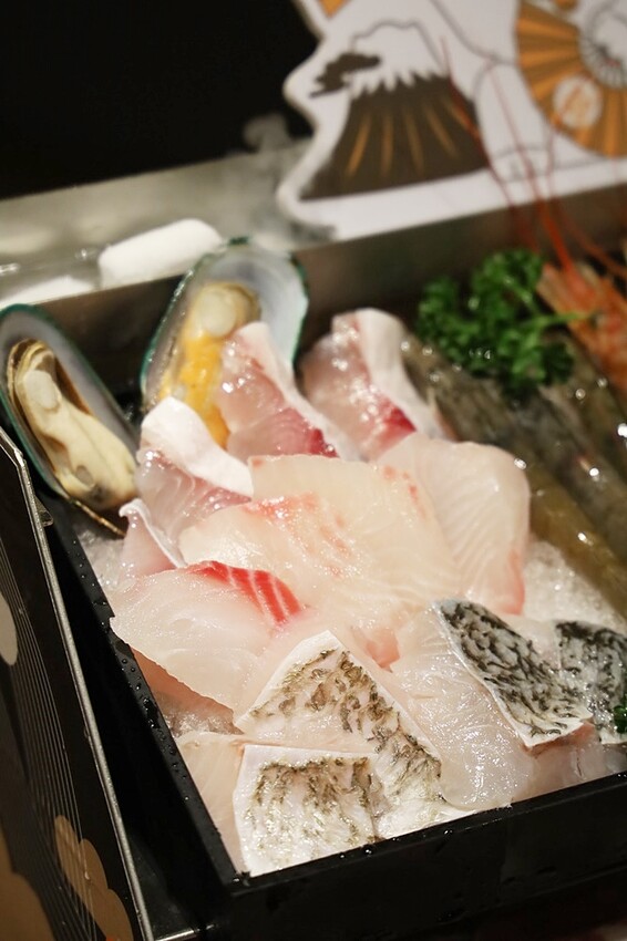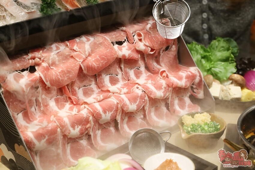 下層擺的是雪花豬肉,隨著乾冰飄出雲霧,接著最上層則是放~上著各種海鮮,包含天使紅蝦、草蝦、鮭魚片、鯛魚片、九孔、蛤蠣及整尾花枝一次來。
