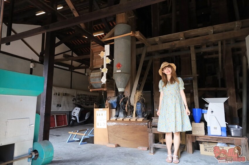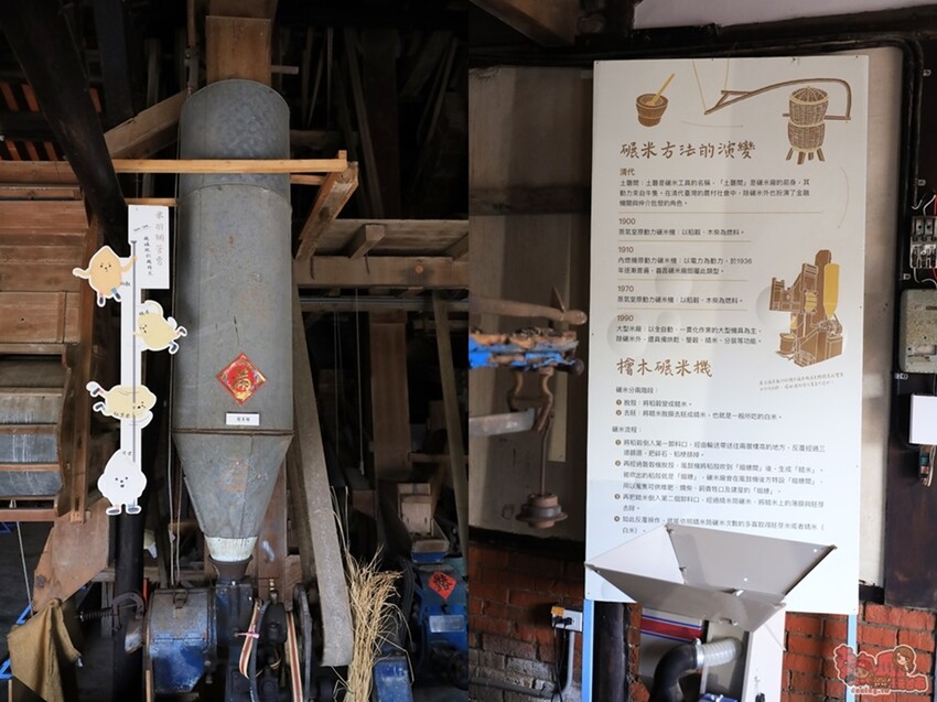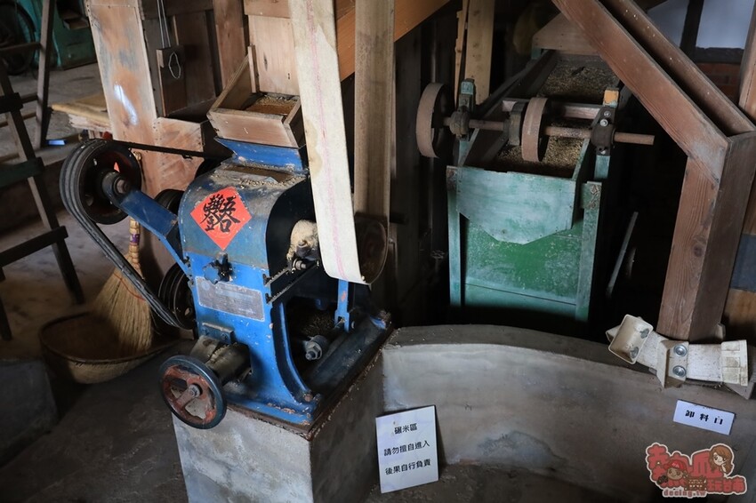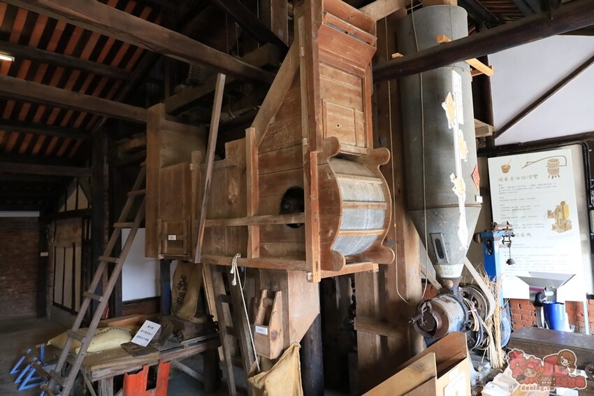 義昌碾米廠裡面也完整保留了兩層樓高的檜木碾米機,聽工作人員說:這台原本很難修復了,後來是拿到其它碾米機的零件,才得以再次啟動,目前雖已不像以前那樣牢固使用,但有更多的教育意義存在,碾米廠內也有專人導覽解說,也可以參與碾米體驗,是很寓教於樂的一個所在。