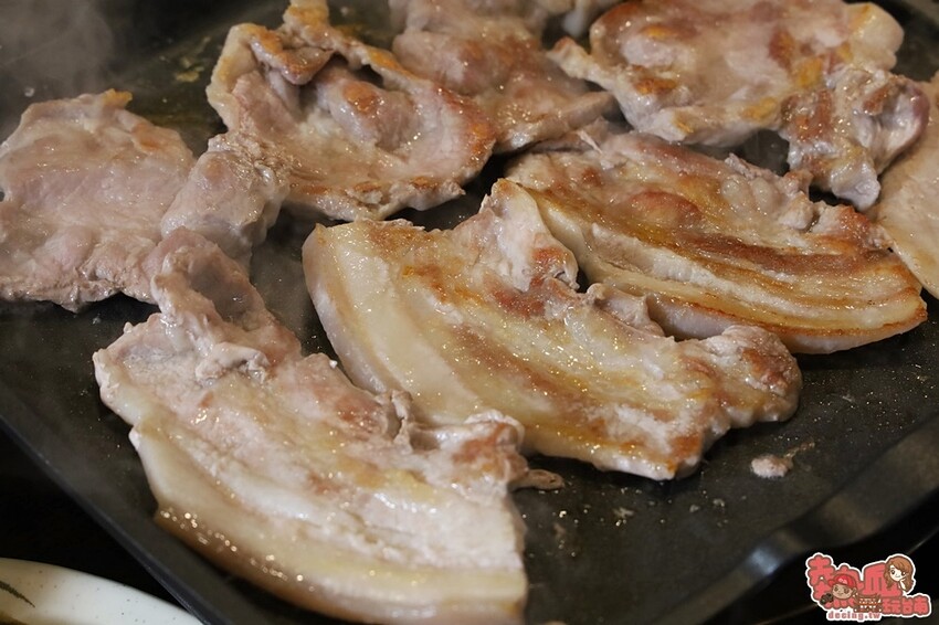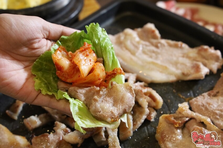 接著將豬五花剪到細長狀,繼續讓他在烤盤上烤到微微焦香,這樣吃起來單吃就好吃!不能錯過得,還有生菜豪氣放滿肉,加入泡菜或店家提供的沾醬,表面微脆又香,好吃啦~