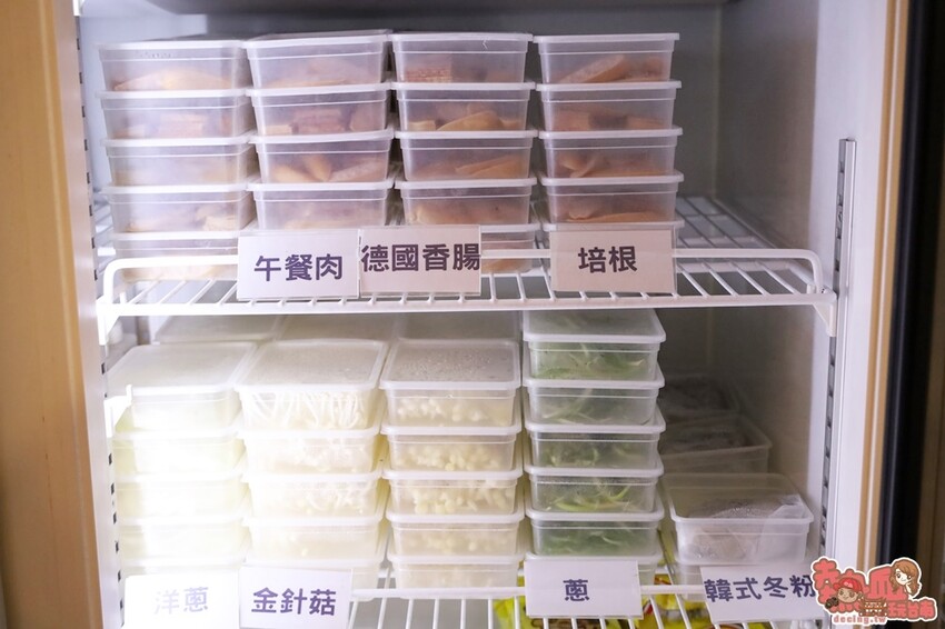 來看看店內的自助區,大致上分為兩大區域,由於室內空間有限,所以自助取餐區也分別隔開,門口進來左邊這一區冰箱櫃,下層的各式小菜、麥茶則是消費就可無限取用,另也提供費用另計的韓國啤酒和飲料;右上這區以保鮮盒盛裝的各種食材,則是199元韓國部隊鍋專區。