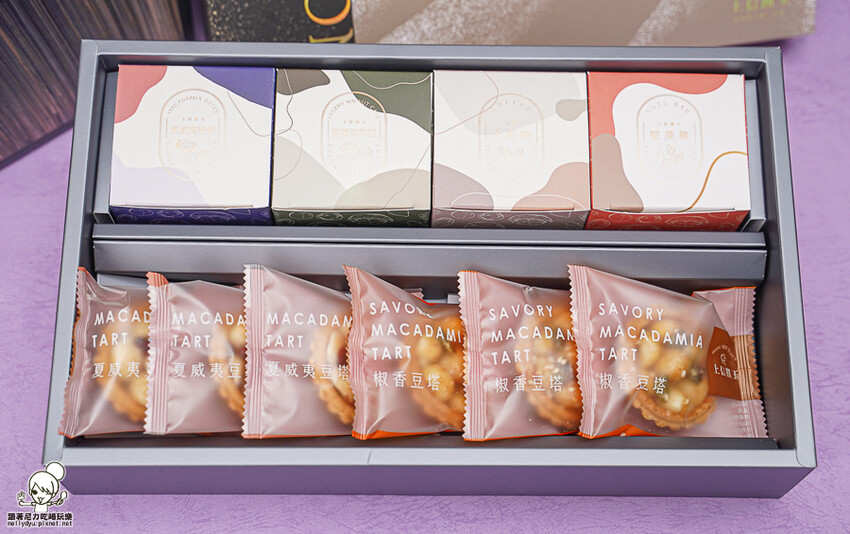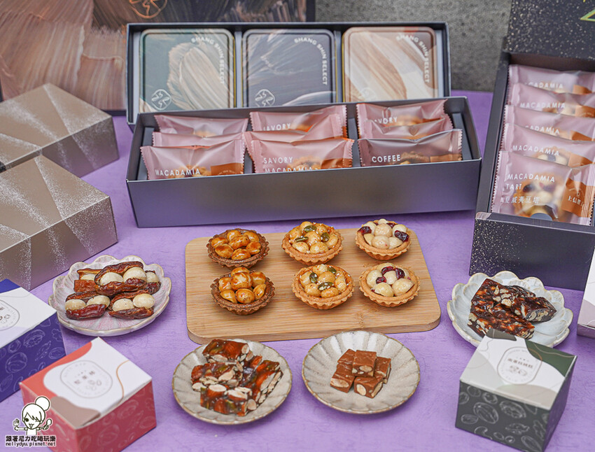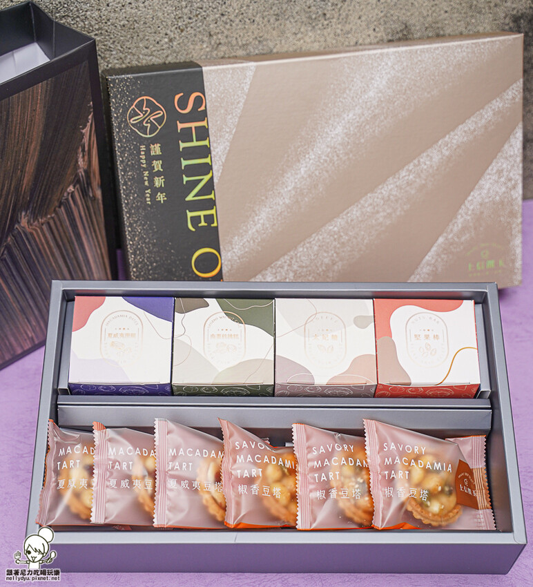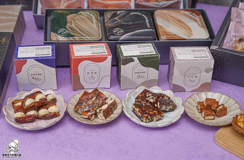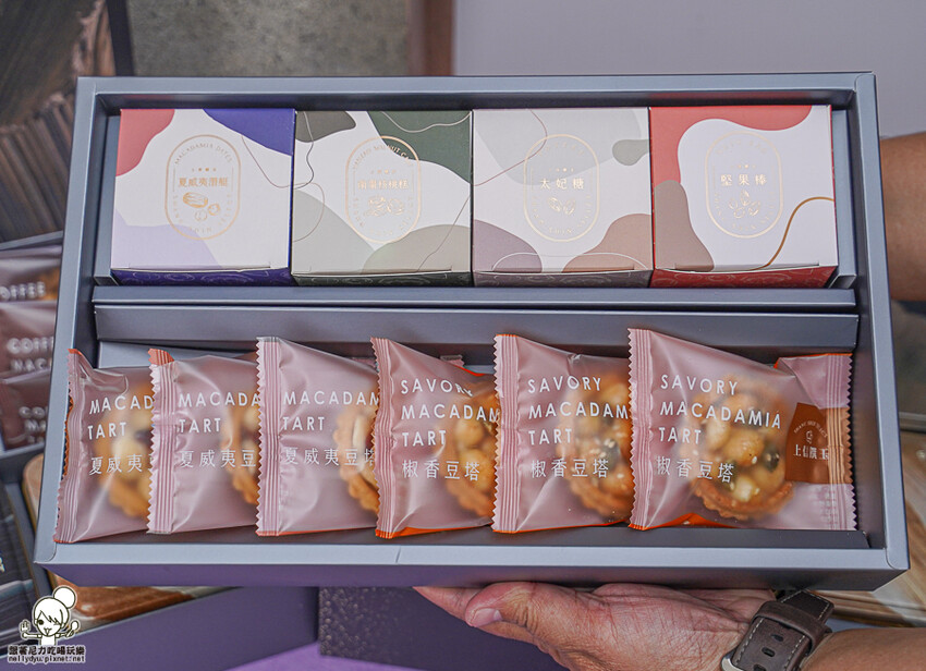 夏威夷豆塔3入、椒香豆塔3入、太妃糖5入小方盒、堅果棒5入小方盒、夏威夷潛艇5入小方盒、南棗核桃糕5入小方盒
