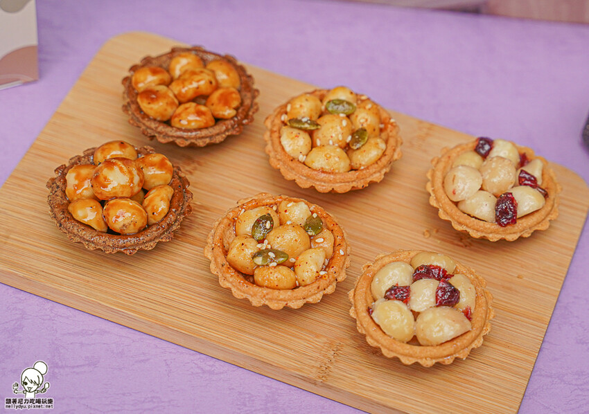 夏威夷豆塔3入 -蛋奶素、椒香豆塔3入 -純素、夏威夷潛艇5入小方盒 -純素、南棗核桃糕5入小方盒 -奶素、太妃糖5入小方盒 -奶素、堅果棒5入小方盒 -奶素